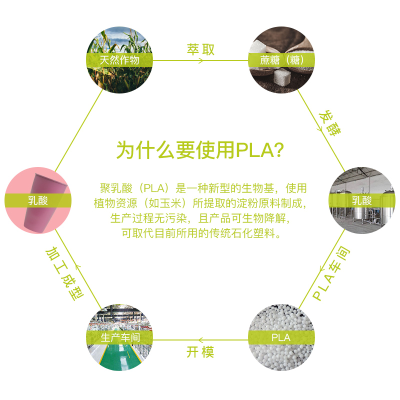 PLA 材料是以玉米和木薯为原料,通过提取淀粉,将天然资源(玉米和木薯)制成聚乳酸原料,