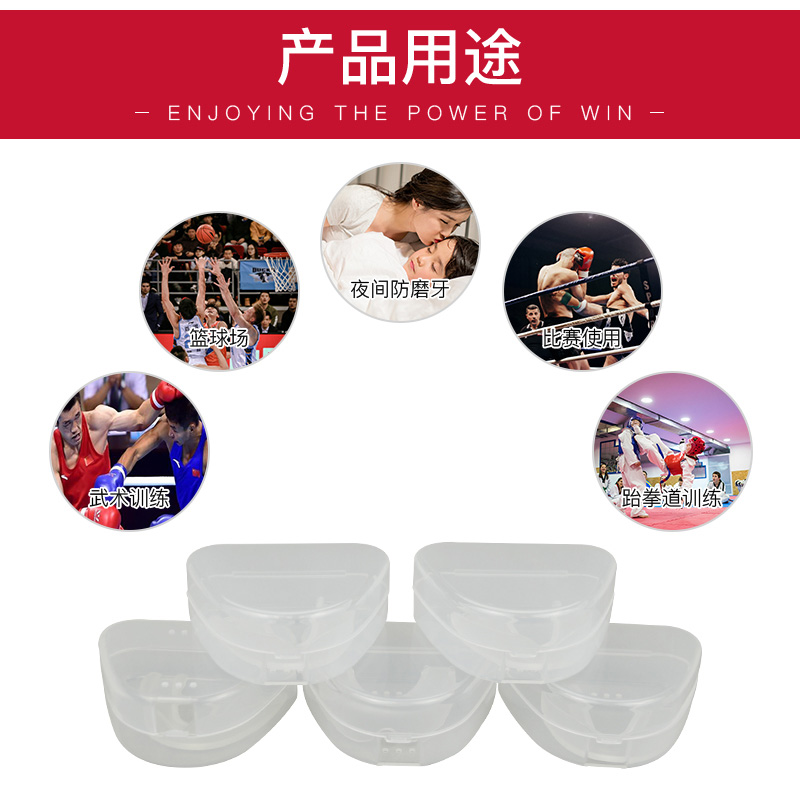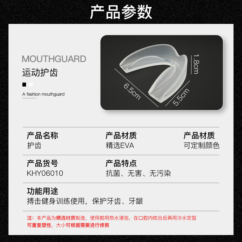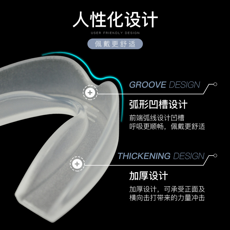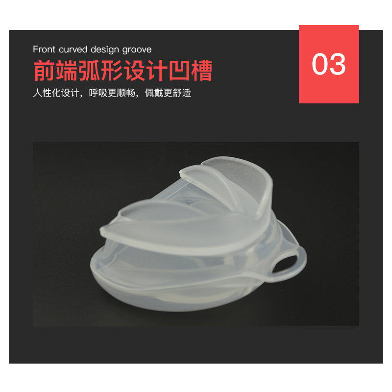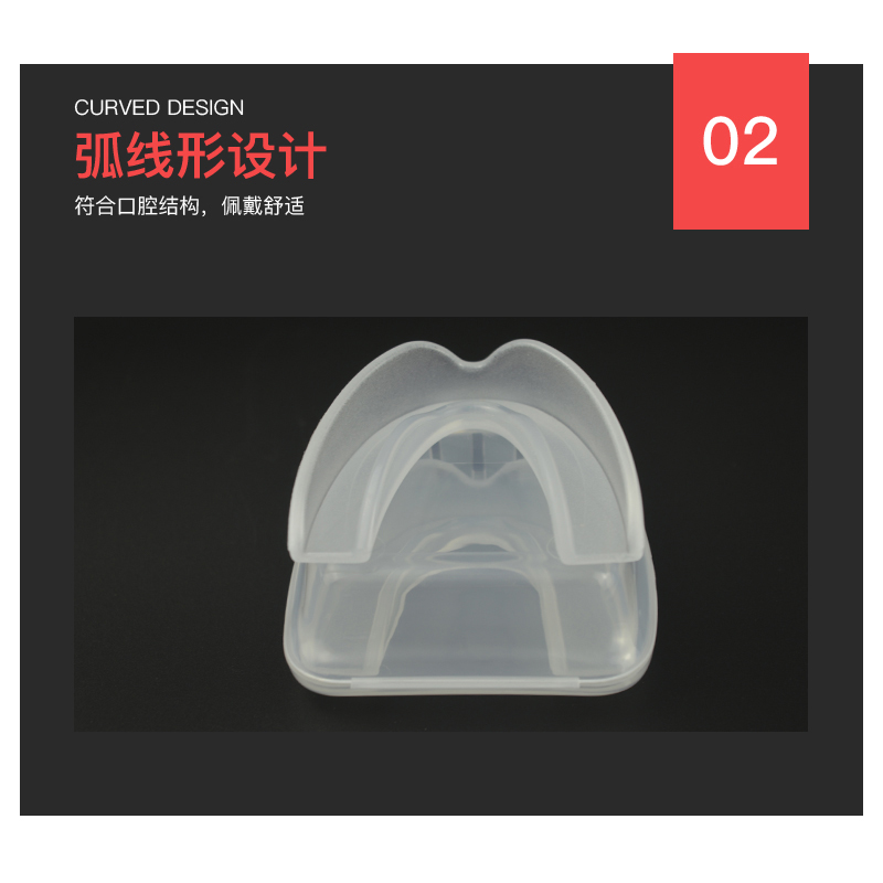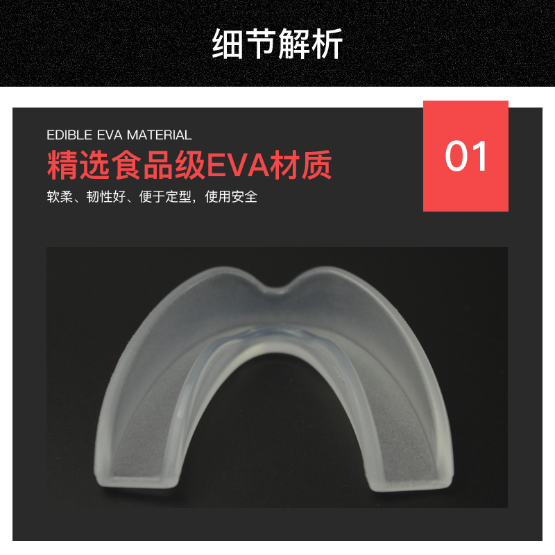 护齿采用食品级EVA 制作,无毒无味,并根据人体口腔结构设计,能有效的保护配戴者的口腔软组织,且呼吸顺畅,无阻隔感。