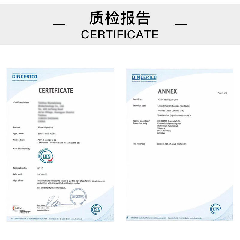 竹纤维植物材质作为食品级材料,因为竹纤维原料里面没有添加滑石粉,漂白剂等化学成分,这也导致材质看起来不会像塑料那么亮白,光滑,但是却比塑料的餐具健康。其加工工艺为将竹子打碎成粉末,再压制成餐具,受热温度110℃,冷藏温度-10℃,所以其完全可以放入微波炉和冰箱。